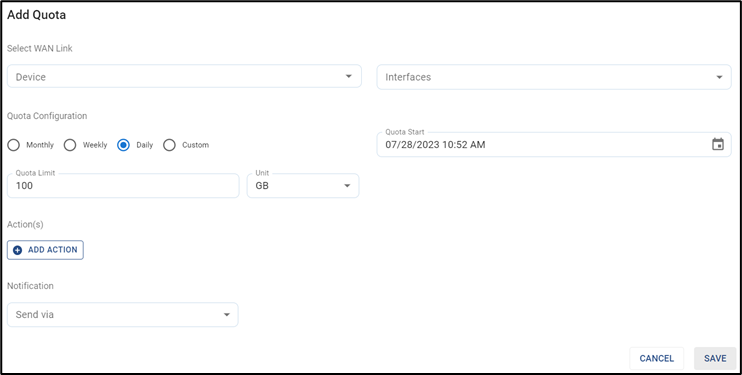 Multiple Quota Actions can be set for the Edge SD-WAN device, including: