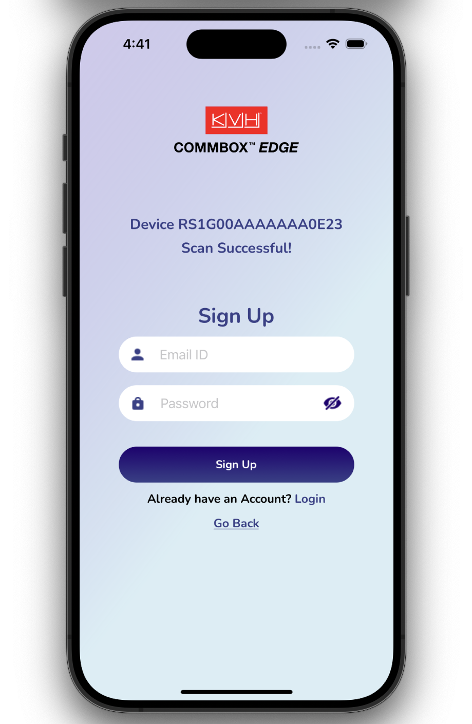 After a successful scan, the device details are displayed. Enter your email ID and set your password to sign up.