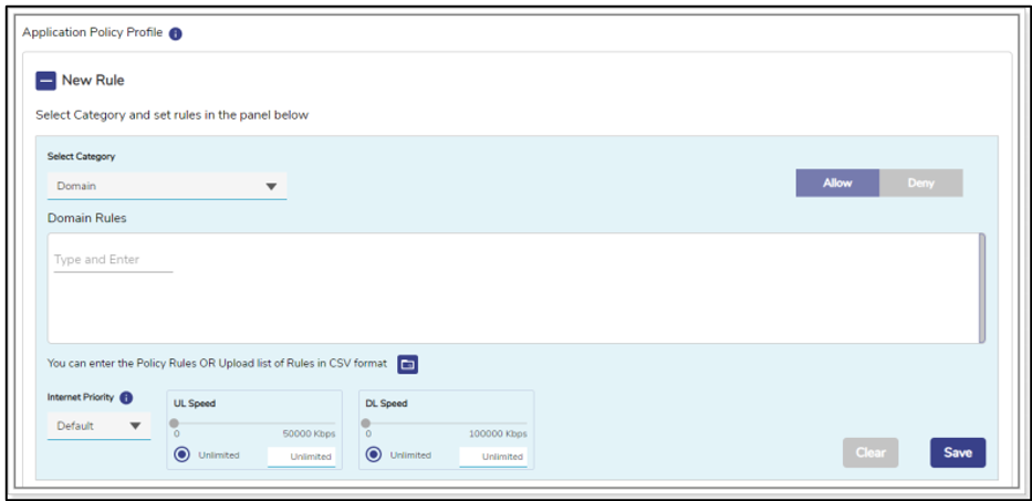 The allowed and blocked domain becomes available. If user selects the Domain Rule in the Select Category field, then the Domain Rules field becomes available. |