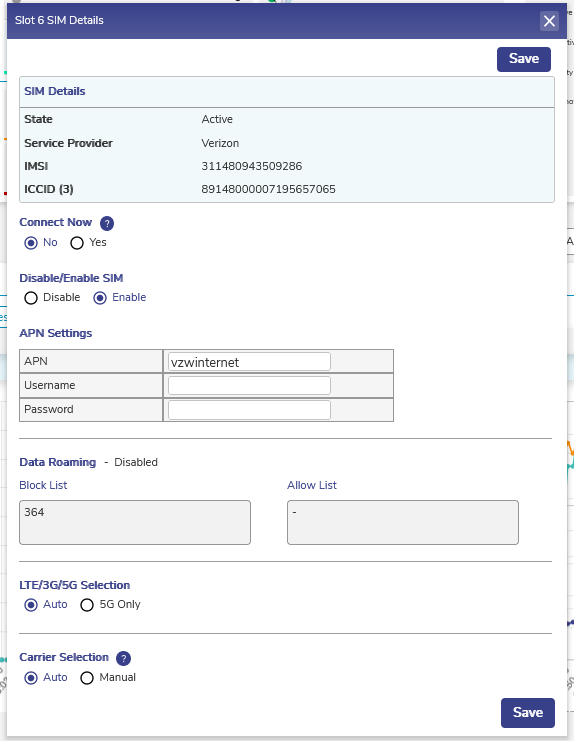 For any NonK4 SIM, the allow and block list can be configured. If the Allow list is configured then the SIM will be used only in those regions where the specific MCC is visible. If the Block list is configured, then in those specific countries or MCCs the SIM strictly will not be used. Use caution while updating the allow list, as it is strict list and the SIM will be used only in those country regions.
