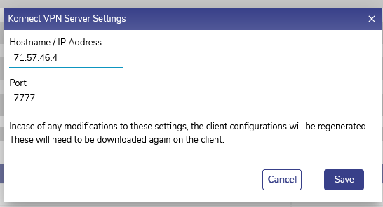 Note: In the current 6.4.1 release, Konnect VPN server needs the public IP to be configured and the listening port as well. The public IP has to be fetched from the Internet gateway where the Edge Server is connected and the port forwarding has to be enabled on the gateway as well. You can edit/configure the public IP and port for the Konnect VPN server by clicking the pencil icon next “Konnect VPN server”