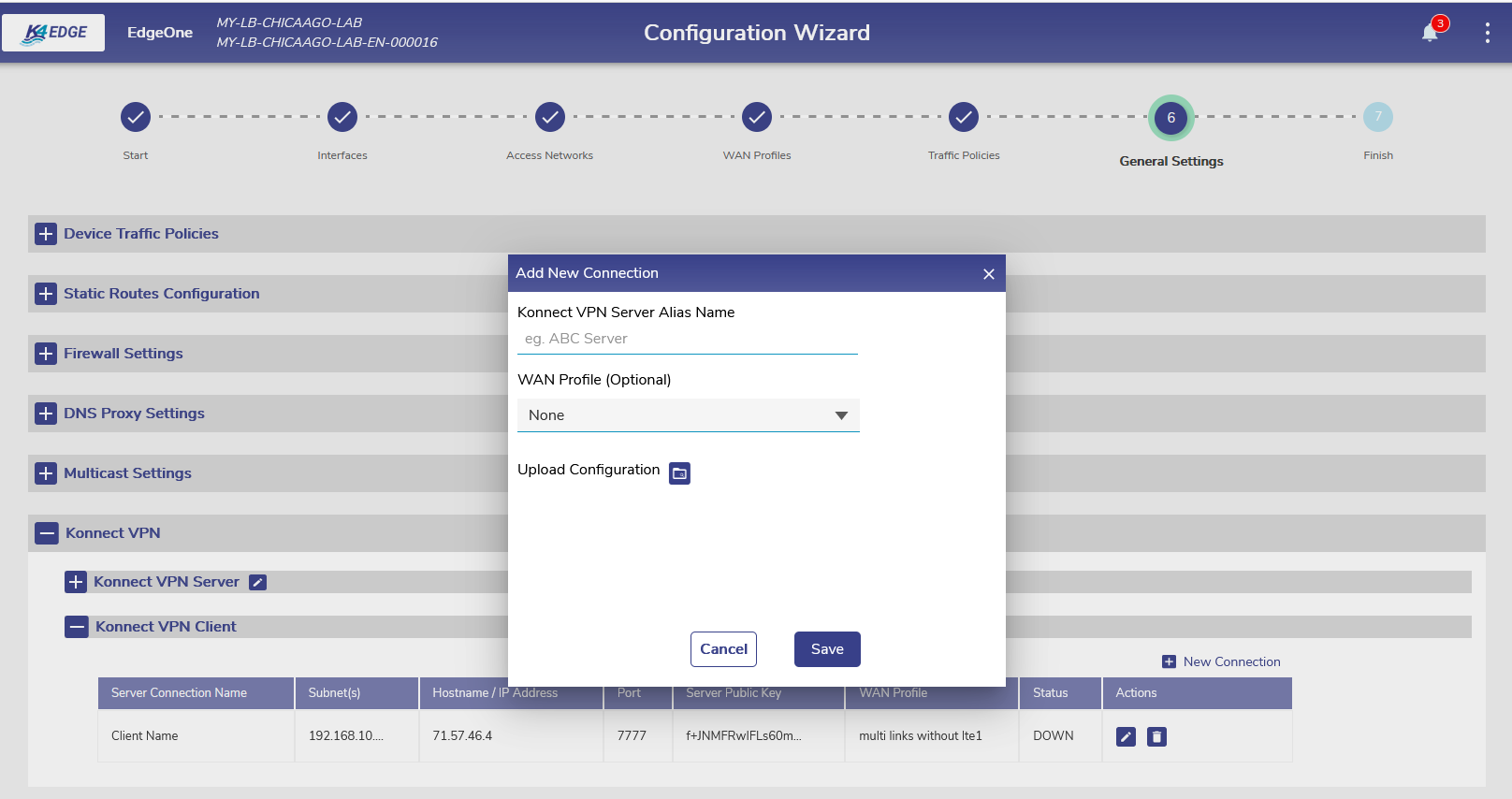 This allows the Edge System to VPN access networks to a Konnect VPN Server; this is most commonly utilized between Edge Servers.