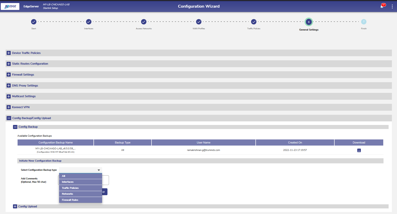 Running configuration of the Edge Server can be saved or applied/restored from the Edge/Web portal from the General Settings in the Configuration Wizard. Configuration is grouped as below