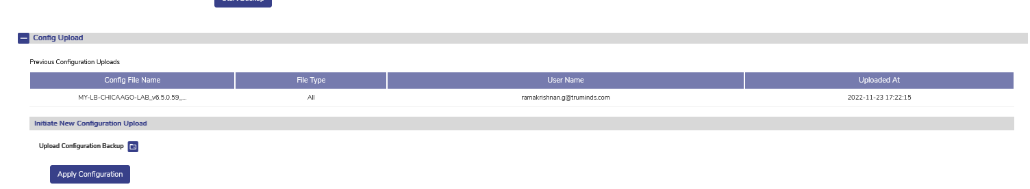 To restore/upload the configuration, click on the “Config Upload” and click the “Upload Configuration Backup” which should open up the File Explorer window. Navigate to the saved configuration file and select the file. Once the file is selected, the file name should show up next to the upload button. Click on “Apply Configuration”. When the configuration is applied, some of the services might get impacted and there will be notification to reboot the system. NOTE: It is highly recommended to reboot the system after applying the configuration, otherwise the system might be working in unsupported state.