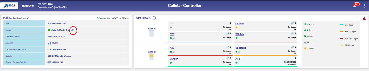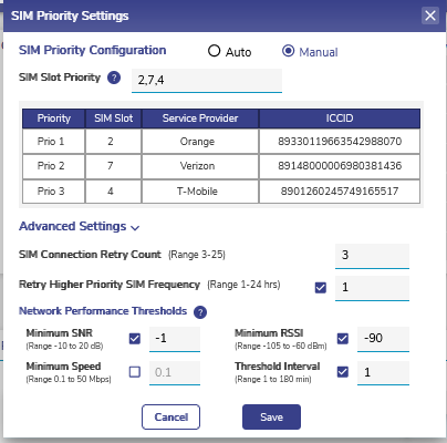 This feature allows the administrator / user to configure the priority of the SIMs to be used. This feature is useful in case of EdgeOne, OneDome devices where there are 8 SIMs per device. Click on the pencil icon next SIMs listed under the Status section. On clicking the pencil, there is a pop up in which the SIMs can be entered as comma separated SIM Slot numbers in a prioritized order. For more advance settings like retrying the high priority SIM periodically or to set threshold for good call quality etc, click on the “Advanced Settings”. Note: Use caution while configuring the Advanced Settings as it might lead to constant call bounce or not connecting in poor areas etc.