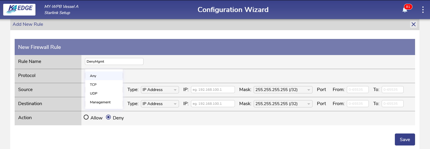 With 6.5.1 release, under the firewall section there is a new protocol drop down introduced “Management”. This category can be used to allow/drop access to the management traffic to the server either from LAN or WAN interfaces.