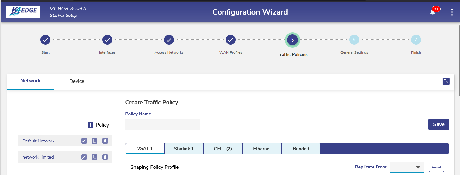 Allows the Network or Device policy can be copied or replicated by clicking the copy button (next to the edit pencil icon). On click of that copy button it duplicates the traffic policy which can be edited further by the user