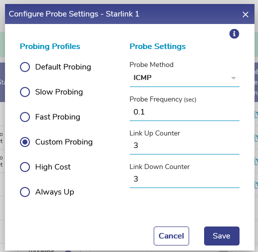 With Starlink deployments - especially with dual links, the availability changes between the two links very rapidly. To detect these drops quickly, we support the probe configuration as minimum as 100msec. With this configuration, we should be able to detect the link up/down quickly within few hundreds of msec. Note: With this 100msec configuration, the link will be probed every 100msec, which will lead to increased usage on that link, hence use this configuration based on the plan of the interface.