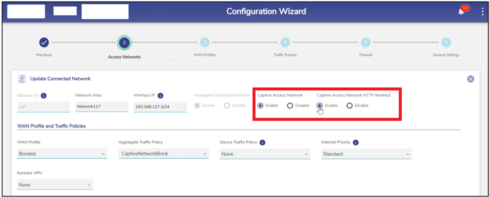 To configure an Access network as Captive, the admin must first create the Network Traffic Policy and the network must be configured as Captive Access Network in the CommBox EdgeOS Portal.
