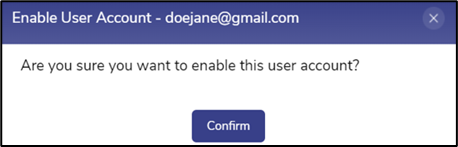 After verification of user details, the admin can click Toggle button to enable the user account. The Enable User Account dialog box opens.