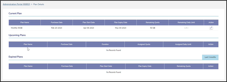 The Plan Details sections displays information about the Current plans, Upcoming plans and the Expired plans.