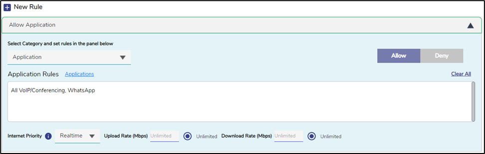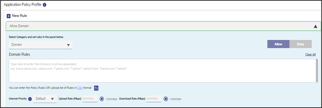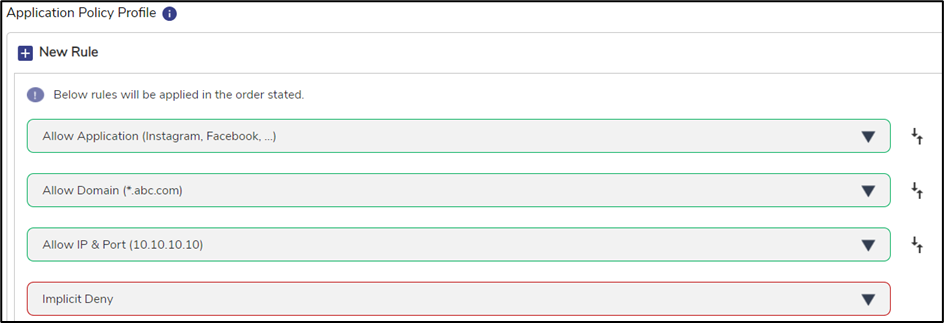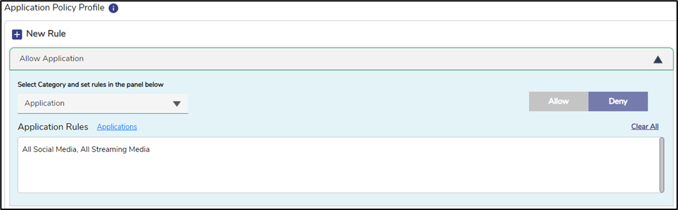 To deny access to all Social media and Streaming applications, click + New Rule button under the Application Policy Profile section.