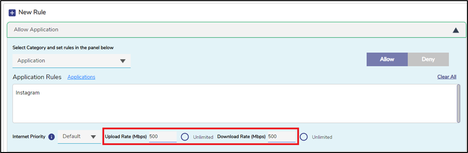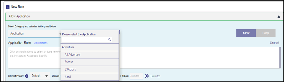 Within a Traffic Policy, users can also define an Application Policy Profile. These policies control what applications are allowed and denied. There are over 500 different applications, covering Advertisements and Streaming Media to Software Updates and VPN Software. Each Application Rule can be configured to control the application’s upload and download speed. Traffic policies can be applied at a network or device level using the mac address or IP Address.