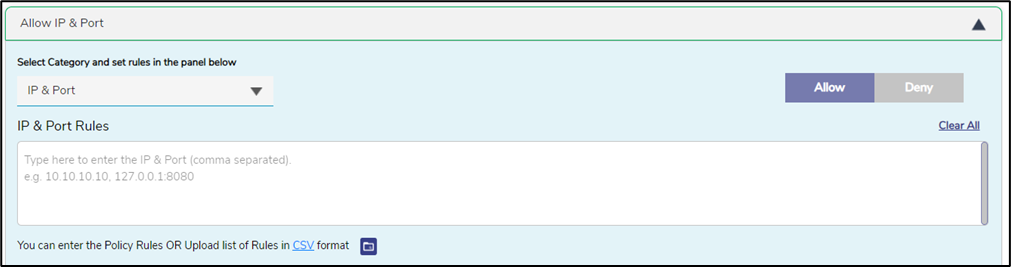 Enter the required IP and Port combinations in the IP & Port Rules textbox for which the user might need access. The combinations must be separated by comma. For example: 10.10.10.10