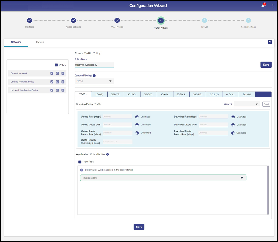 Traffic Policies allow the user to control the upload and download speed for networks and hosts connected to the Edge appliance. Users can also control how much data can be uploaded or downloaded (Quota) on different WAN technologies and how often the data cap or quota is refreshed (1hr - 24hr) by setting Traffic Policies.