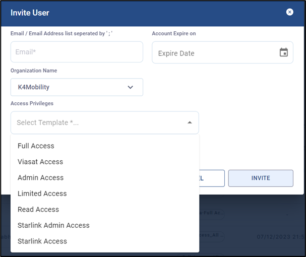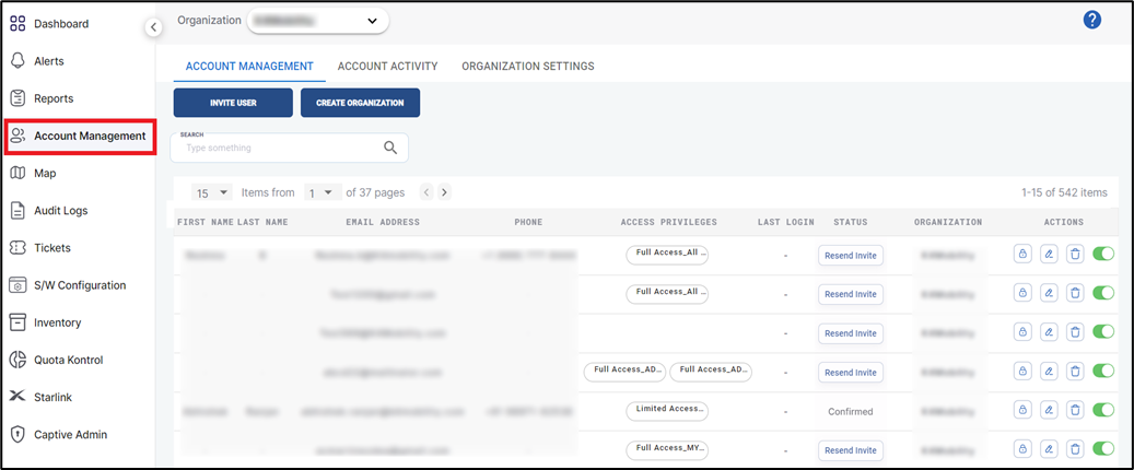Note: The users that are given access only for Starlink operations cannot access the other options in CommBox Edge Cloud Portal such as Dashboard, Alerts, Reports, Account Management, Map, Audit Logs, Tickets, S/W Configuration, Inventory, Quota Kontrol and Captive Admin. The user account needs Full Access Privilege to access these features.