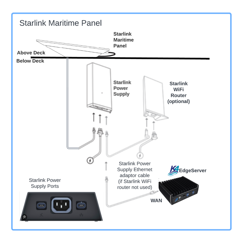 Each Starlink Maritime Panel will have a single GE link from the Starlink Power supply unit; this GE link will connect to a EdgeServer WAN ports.