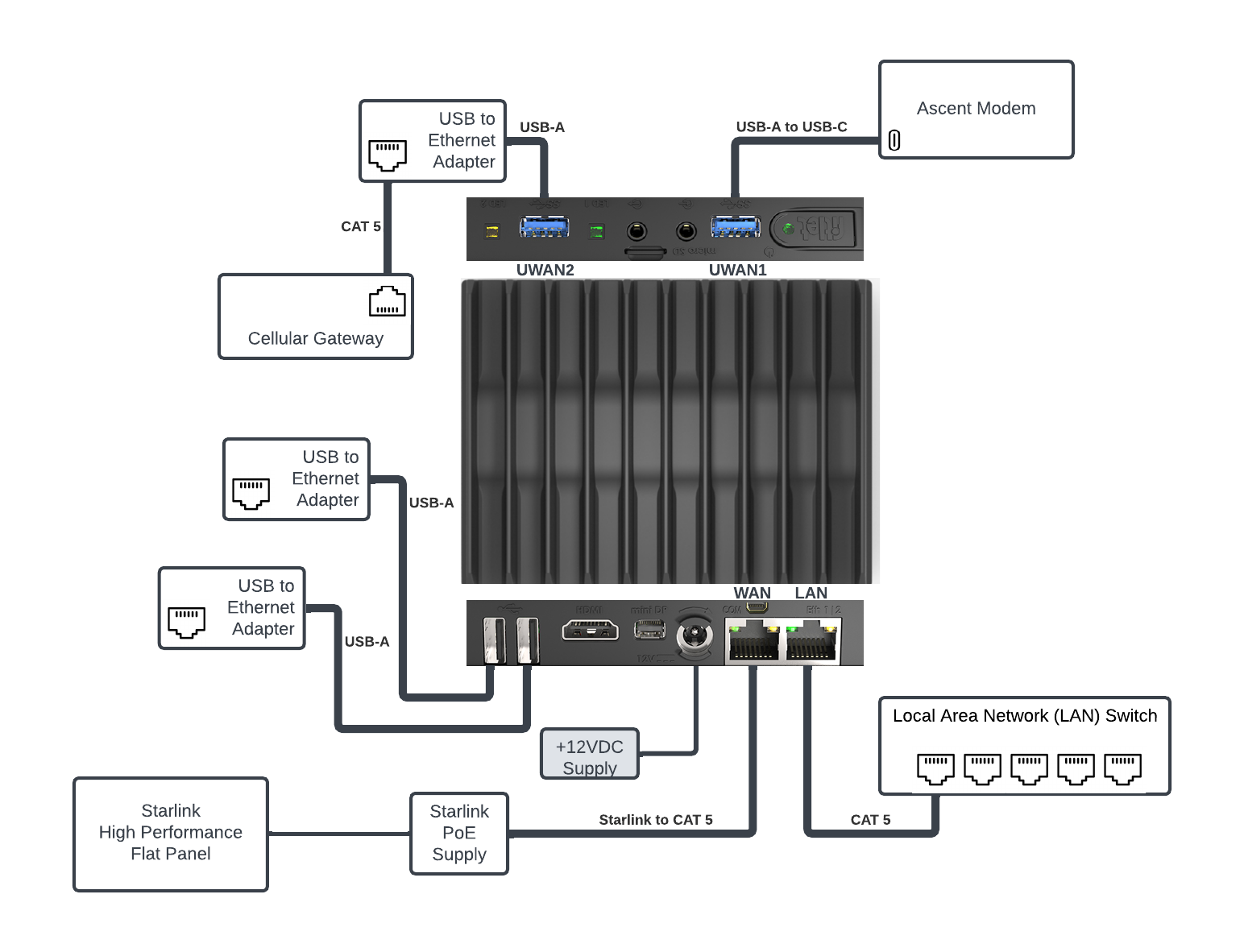 The figure below shows a common configuration of CommBox Edge 2 using: Starlink, an Ethernet Cellular Gateway through a USB to Ethernet expansion dongle, a USB-C Ascent Modem, an ethernet LAN switch, and two USB to Ethernet dongles for additional WAN sources.