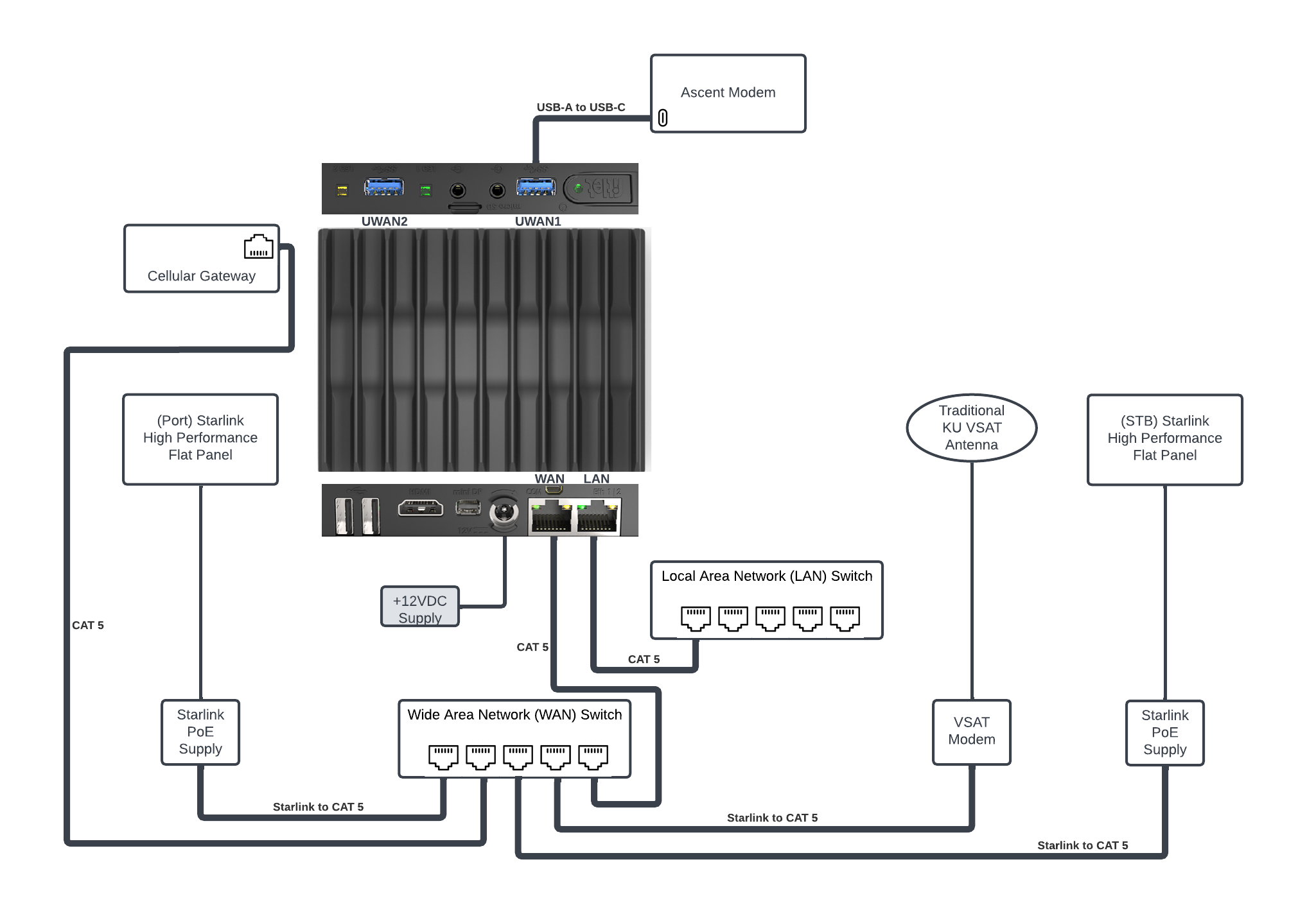 The figure below shows a common configuration of CommBox Edge 2 using: An ethernet LAN switch, a USB-C Ascent Modem 5G, and a 5-port ethernet switch for WAN selection of: Dual Starlink Terminals, a KU VSAT Terminal, and an Ethernet Cellular Gateway.