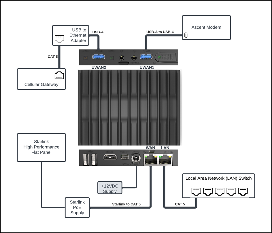 The figure below shows a common configuration of CommBox Edge 2 using: Starlink, an Ethernet Cellular Gateway, a USB-C Ascent Modem, and an ethernet LAN switch.